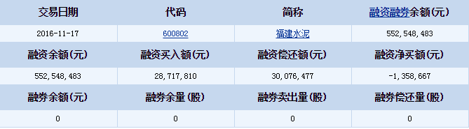 福建水泥(600802)2016-11-17融資融券信息顯示,福建水泥融資余額552,548,483元,融券余額0元,融資買入額28,717,810元,融資償還額30,076,477元,融資凈買額-1,358,667元,融券余量0股,融券賣出量0股,融券償還量0股,融資融券余額552,548,483元。福建水泥融資融券詳細信息如下表: