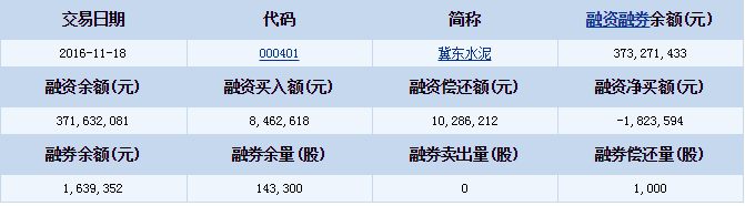 冀東水泥(000401)2016-11-18融資融券信息顯示,冀東水泥融資余額371,632,081元,融券余額1,639,352元,融資買入額8,462,618元,融資償還額10,286,212元,融資凈買額-1,823,594元,融券余量143,300股,融券賣出量0股,融券償還量1,000股,融資融券余額373,271,433元。冀東水泥融資融券詳細(xì)信息如下表: