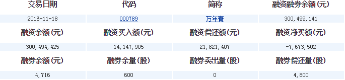 萬(wàn)年青(000789)2016-11-18融資融券信息顯示,萬(wàn)年青融資余額300,494,425元,融券余額4,716元,融資買入額14,147,905元,融資償還額21,821,407元,融資凈買額-7,673,502元,融券余量600股,融券賣出量0股,融券償還量4,800股,融資融券余額300,499,141元。萬(wàn)年青融資融券詳細(xì)信息如下表: