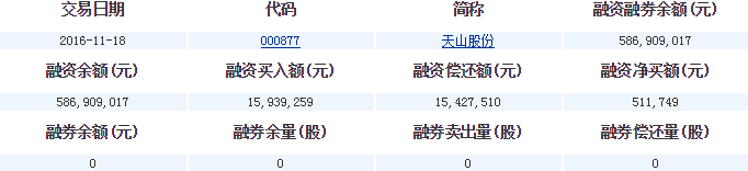 天山股份(000877)2016-11-18融資融券信息顯示,天山股份融資余額586,909,017元,融券余額0元,融資買入額15,939,259元,融資償還額15,427,510元,融資凈買額511,749元,融券余量0股,融券賣出量0股,融券償還量0股,融資融券余額586,909,017元。天山股份融資融券詳細信息如下表: