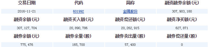 金隅股份(601992)2016-11-21融資融券信息顯示,金隅股份融資余額307,127,704元,融券余額775,476元,融資買(mǎi)入額20,890,786元,融資償還額20,262,915元,融資凈買(mǎi)額627,871元,融券余量165,700股,融券賣(mài)出量57,400股,融券償還量0股,融資融券余額307,903,180元。金隅股份融資融券詳細(xì)信息如下表: