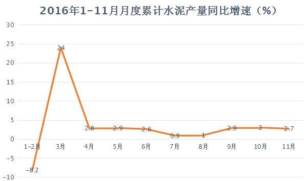 圖1 2016年1-11月月度累計水泥產量同比增速