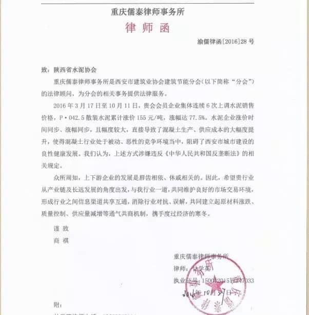 無獨有偶,今年10月份,西安水泥價格暴漲,引起了西安地區(qū)混凝土生產(chǎn),供應(yīng)成本的大幅提升,使得當?shù)鼗炷列袠I(yè)處于被動地位,西安市建筑業(yè)協(xié)會建筑節(jié)能分會認為這一市場情況違反了《中華人民共和國反壟斷法》的相關(guān)規(guī)定,向陜西省水泥協(xié)會發(fā)律師函。