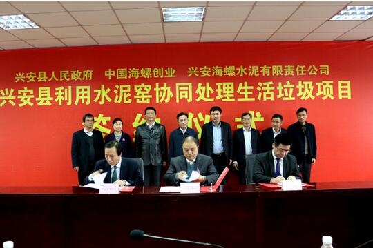近日,海螺創(chuàng)業(yè)與興安縣人民政府正式簽署《利用水泥窯協(xié)同處理生活垃圾項(xiàng)目投資協(xié)議》。該項(xiàng)目日處理能力達(dá)300噸/天,力爭(zhēng)一年建成投運(yùn)。