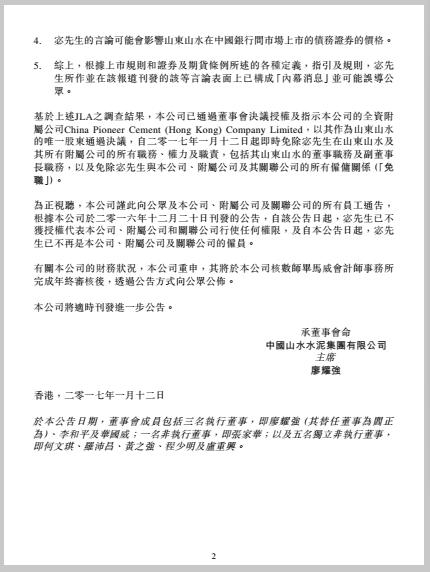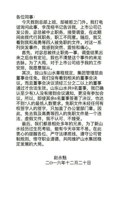 天瑞集團控股山水水泥后,新山水水泥明顯出現(xiàn)了以老一派維權宓敬田為代表的派系與以天瑞高管為代表的山水水泥“新董事會”的爭斗,其內(nèi)部派系爭斗非常強烈。去年12月19日山水水泥上市公司發(fā)出公告,宓敬田因言論失職暫時免職,由趙永魁代其職,然而該公告很快又被撤銷,取而代之的是一份對趙永魁、高勇、劉德權、趙彬的免職文件,免職理由是嚴重違反集團基本政治紀律,破壞山水集團穩(wěn)定發(fā)展的大局,影響惡劣。