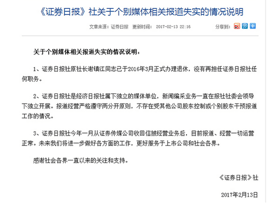 1.證券日報(bào)社原社長謝鎮(zhèn)江同志已于2016年3月正式辦理退休,沒有再擔(dān)任證券日報(bào)社任何職務(wù)。