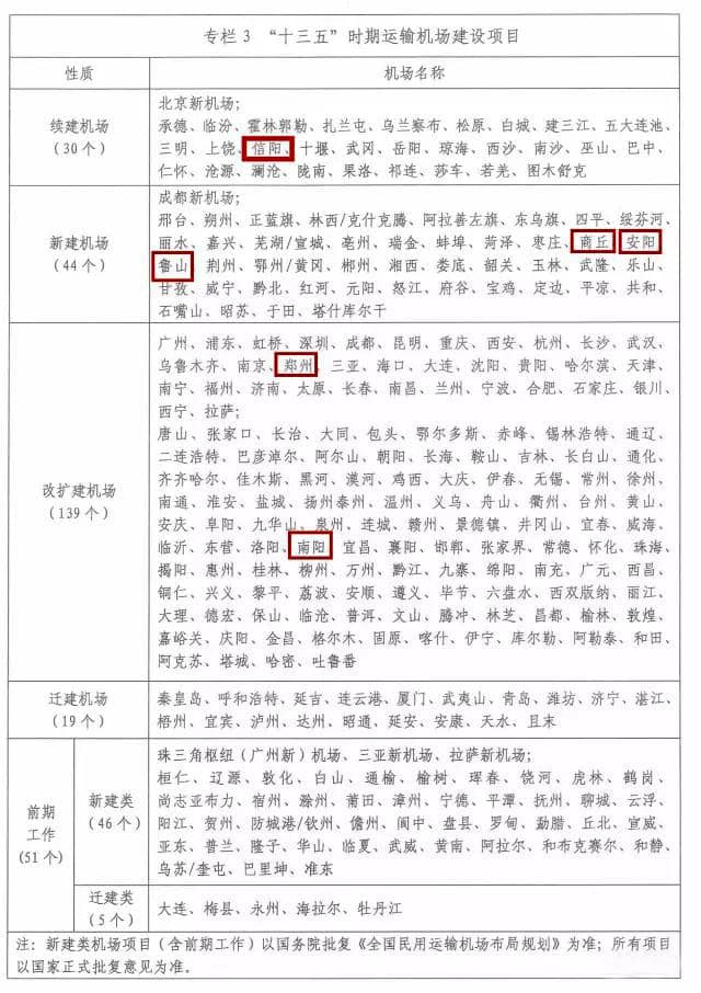 在《規(guī)劃》“十三五”時(shí)期運(yùn)輸機(jī)場(chǎng)建設(shè)項(xiàng)目的表格中,續(xù)建機(jī)場(chǎng)項(xiàng)目有30個(gè),其中包括信陽(yáng)市續(xù)建機(jī)場(chǎng)項(xiàng)目;新建機(jī)場(chǎng)項(xiàng)目44個(gè),其中包括河南省商丘、安陽(yáng)、魯山新建機(jī)場(chǎng)項(xiàng)目;改擴(kuò)建機(jī)場(chǎng)項(xiàng)目達(dá)到139個(gè),其中包括河南省鄭州市、南陽(yáng)市改擴(kuò)建機(jī)場(chǎng)項(xiàng)目。