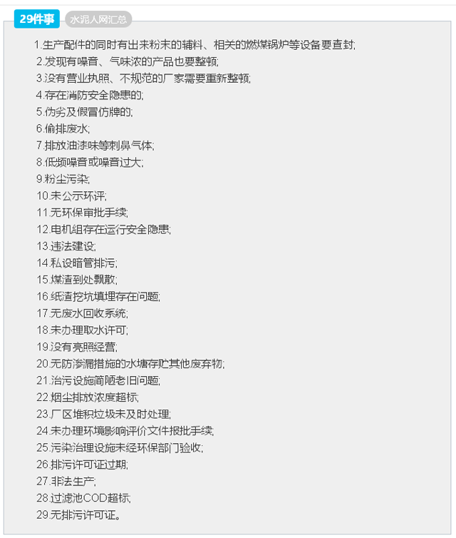 今年2月15日-3月15日,中央環(huán)保督察組會同北京市,天津市,河北省石家莊、廊坊、保定、唐山、邯鄲、邢臺、滄州、衡水市,山西省太原、臨汾市,山東省濟南、德州市,河南省鄭州、鶴壁、焦作、安陽市6個省(市)開展了2017年度第一季度空氣質(zhì)量專項督查,發(fā)現(xiàn)問題不少。今年余下的時間,中央環(huán)保督查組將對剩下的15個省份進行環(huán)保督查全覆蓋,包括新疆、西藏、貴州、湖南、安徽、四川、山西、山東、天津、海南、遼寧、吉林、浙江、上海、福建等。環(huán)保部提醒各企業(yè):以下29點沒做好,永遠別想開工!水泥企業(yè)要注意啦!
