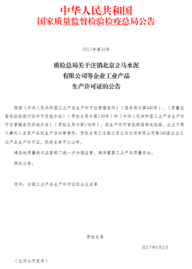 根據(jù)《中華人民共和國(guó)工業(yè)產(chǎn)品生產(chǎn)許可證管理?xiàng)l例》(國(guó)務(wù)院令第440號(hào))、《質(zhì)量監(jiān)督檢驗(yàn)檢疫行政許可實(shí)施辦法》(質(zhì)檢總局令第149號(hào))和《中華人民共和國(guó)工業(yè)產(chǎn)品生產(chǎn)許可證管理?xiàng)l例實(shí)施辦法》(質(zhì)檢總局令第156號(hào)),因生產(chǎn)許可有效期屆滿未延續(xù)、企業(yè)不再?gòu)氖铝腥肽夸洰a(chǎn)品的生產(chǎn)活動(dòng)等情形,質(zhì)檢總局已注銷(xiāo)北京立馬水泥有限公司等346家企業(yè)工業(yè)產(chǎn)品生產(chǎn)許可證,其中水泥企業(yè)共計(jì)274家。