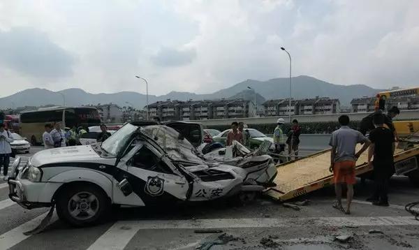 警車后半部幾乎被壓扁