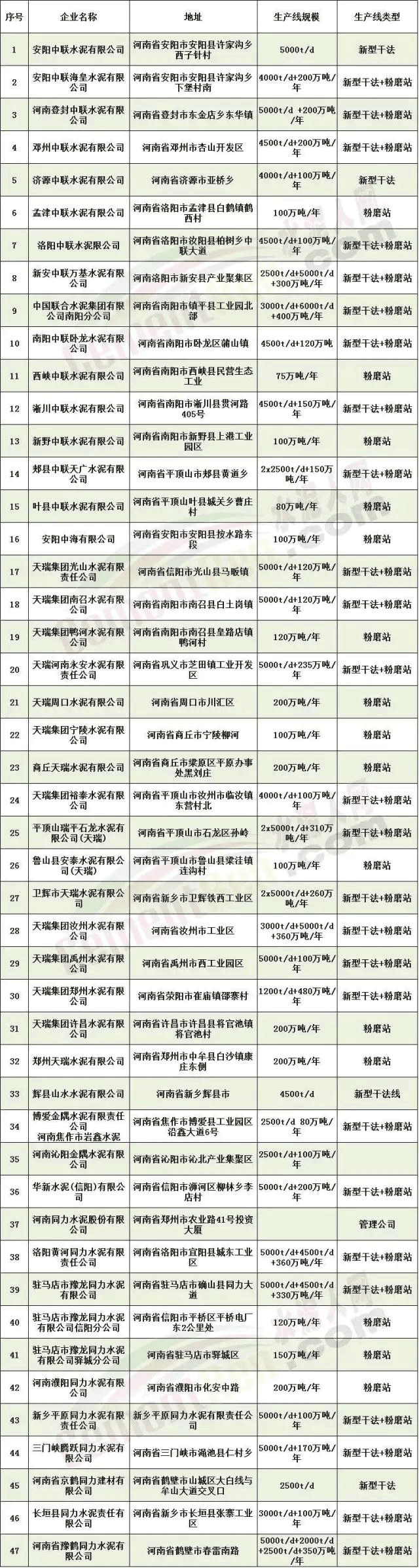 據(jù)相關(guān)數(shù)據(jù)統(tǒng)計(jì)河南省轄區(qū)內(nèi)水泥企業(yè)有50余家,涉及前20強(qiáng)水泥龍頭企業(yè)的熟料生產(chǎn)線40多條。其中包括中國(guó)聯(lián)合水泥14條熟料生產(chǎn)線,天瑞集團(tuán)12條水泥熟料生產(chǎn)線以及同力水泥的11條水泥熟料生產(chǎn)線,也包括華新水泥、山水水泥、金隅水泥等水泥龍頭企業(yè)的水泥熟料生產(chǎn)線。
