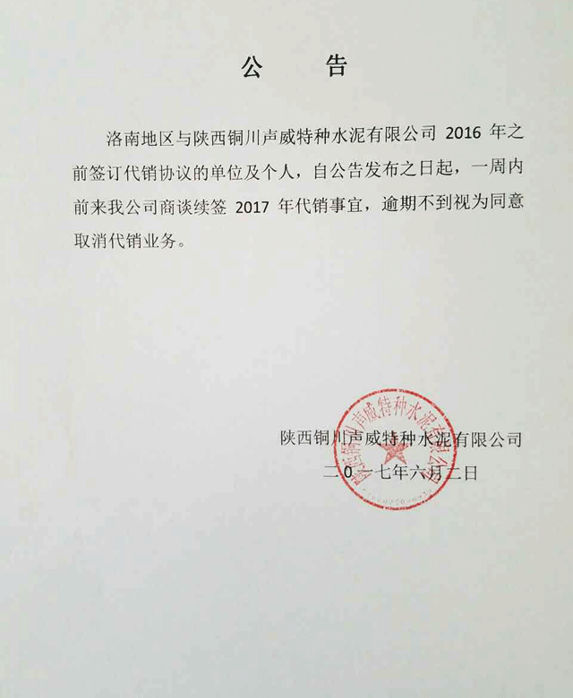 洛南地區(qū)與陜西銅川聲威特種水泥有限公司2016年之前簽訂代銷協(xié)議的單位及個(gè)人,自公告發(fā)布之日起,一周內(nèi)前來我公司商談續(xù)簽2017年代銷事宜,逾期不到視為同意取消代銷業(yè)務(wù)。