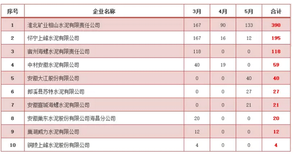 安徽省水泥企業(yè)3~5月廢氣超標(biāo)前十名