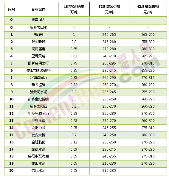 日均銷量最高的是衛(wèi)輝春江水泥,日均水泥銷量在10000噸左右,其32.5袋裝水泥價格為240-265元/噸,42.5散裝水泥價格在265-290元/噸。