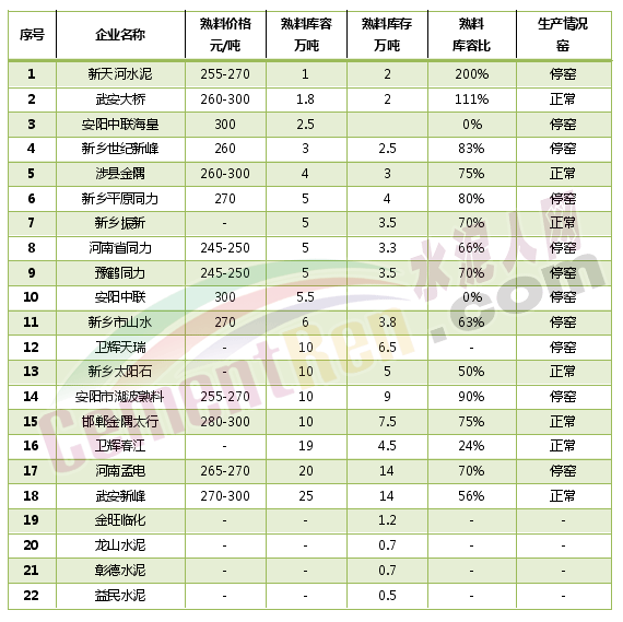 從生產情況來看有11家企業(yè)處于停窯停產情況,分別為:新天河水泥、安陽中聯(lián)?;?、新鄉(xiāng)世紀新峰、新鄉(xiāng)平原同力、河南省同力、豫鶴同力、安陽中聯(lián)、新鄉(xiāng)市山水、衛(wèi)輝天瑞、安陽市湖波熟料、河南孟電。正常生產的共7家企業(yè)分別為:武安大橋、涉縣金隅、新鄉(xiāng)振新、新鄉(xiāng)太陽石、邯鄲金隅太行、衛(wèi)輝春江、武安新峰水泥。