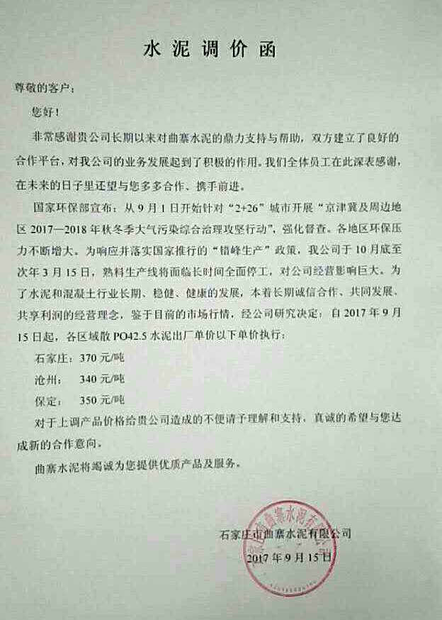 石家莊曲寨水泥的調(diào)價通知稱:國家環(huán)保部宣布從9月1日開始針對“2+26”城市開展“京津冀及周邊地區(qū)2017-2018年秋冬季大氣污染綜合治理攻堅(jiān)行動”,強(qiáng)化督查。各地區(qū)環(huán)保壓力不斷增大。