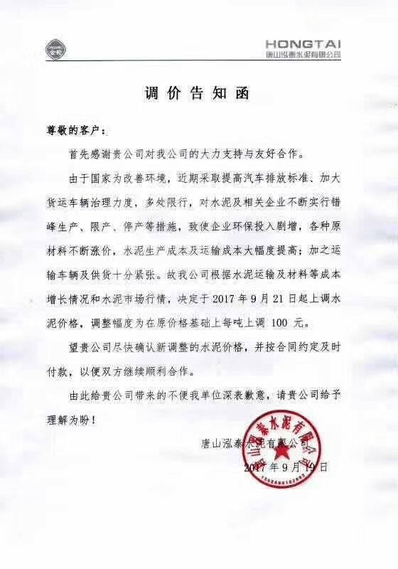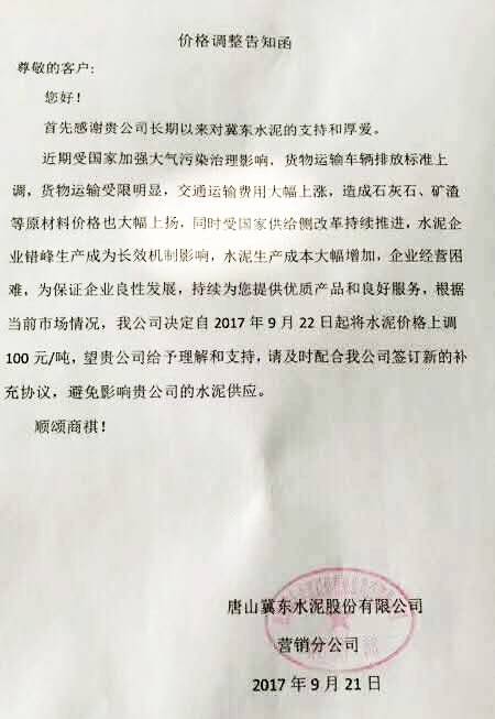 唐山冀東水泥價格調整告知函稱:近期受國家加強大氣污染治理影響,貨物運輸車輛排放標準上調,貨物運輸受限明顯,交通運輸費用大幅上漲,造成石灰石、礦渣等原材料價格也大幅上揚,同時受國家供給側改革持續(xù)推進,水泥企業(yè)錯峰生產成為長效機制影響,水泥生產成本大幅增加,企業(yè)經營困難 ,為保證企業(yè)良性發(fā)展,持續(xù)為客戶提供優(yōu)質產品和良好服務,根據(jù)當前市場情況,自2017年9月22日起將水泥價格上調100元/噸。