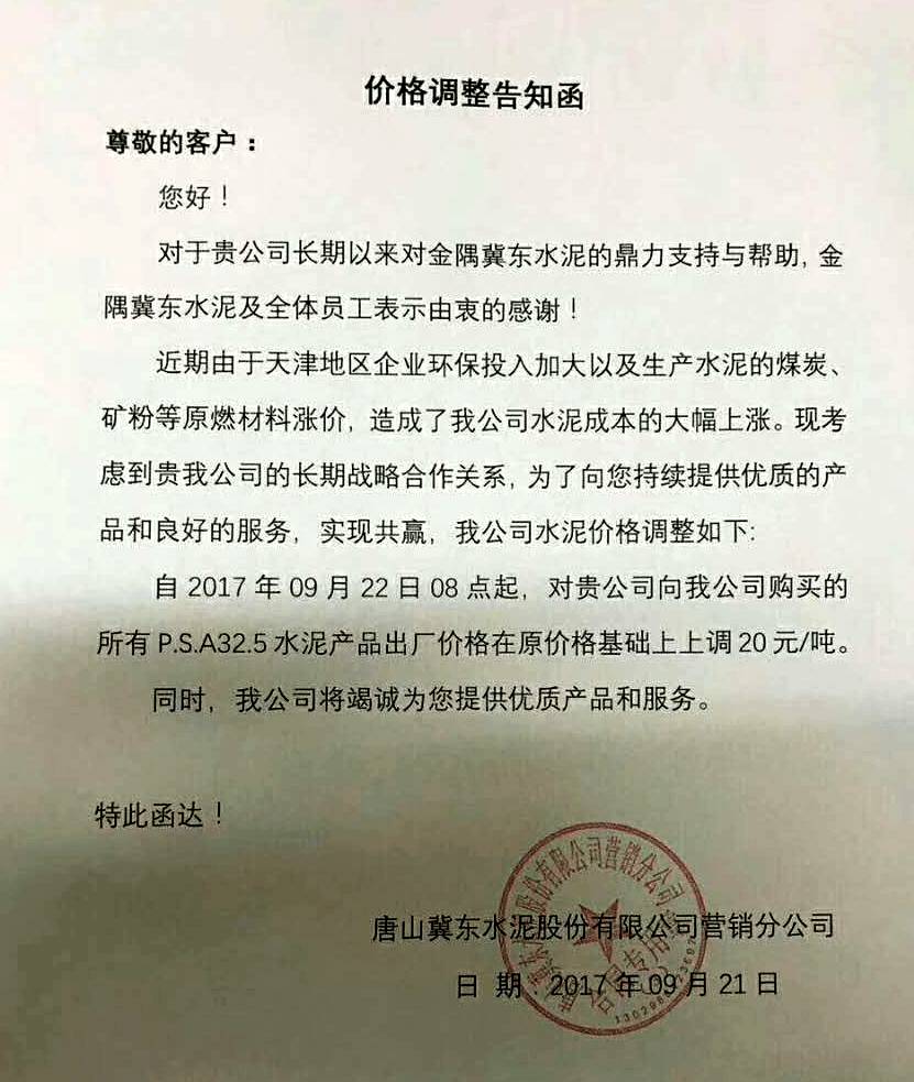 企業(yè)價格調整告知函稱:由于天津地區(qū)企業(yè)環(huán)保投入加大以及生產水泥的煤炭、礦粉等原燃材料漲價,造成了水泥成本的大幅上漲。