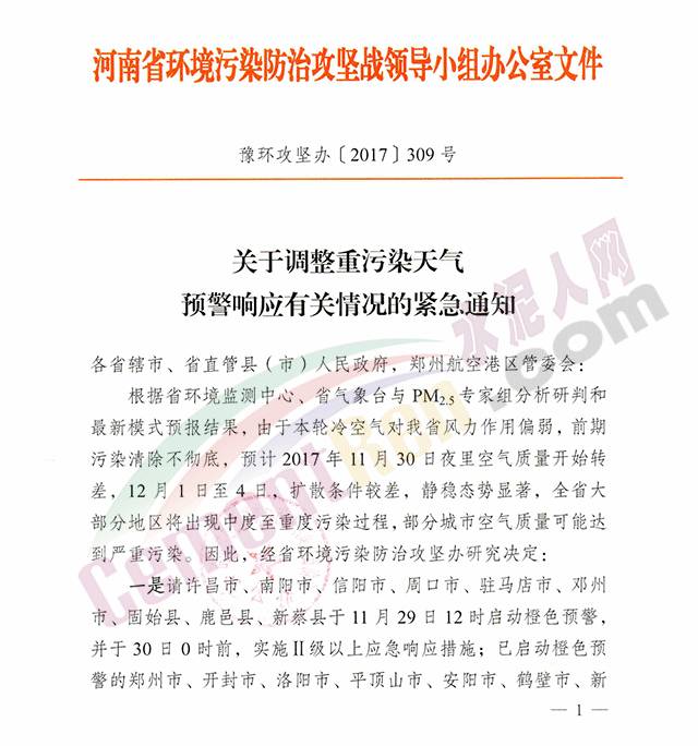 自水泥人網(wǎng)10月30日發(fā)布《河南省七十四家水泥企業(yè)停限產(chǎn)方案(含特種水泥名單)》(點擊閱讀)后,河北省多區(qū)域水泥企業(yè)也將再現(xiàn)集體停產(chǎn)。河南省環(huán)境污染防治攻堅戰(zhàn)領導小組辦公室于近日發(fā)布《關于調(diào)整重污染天氣預警響應有關情況的緊急通知》稱:根據(jù)河南省環(huán)境監(jiān)測中心、省氣象臺與PM2.5專家組分析研判和最新模式預報結(jié)果,預計2017年11月30日夜里空氣質(zhì)量開始轉(zhuǎn)差,12月1日至4日,擴散條件較差,靜穩(wěn)態(tài)勢顯著,全省大部分地區(qū)將出現(xiàn)中度至重度污染過程,部分城市空氣質(zhì)量可能達到嚴重污染。因此,經(jīng)省環(huán)境污染防治攻堅辦研究決定: