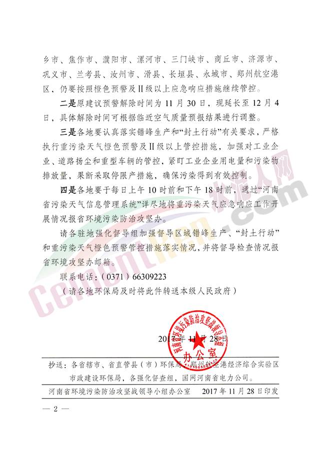 請許昌市、南陽市、信陽市、周口市、駐馬店市、鄧州市、固始縣、鹿邑縣、新蔡縣于11月29日12時啟動橙色預警,并于30日0時前,實施Ⅱ級以上應急響應措施;已啟動橙色預警的鄭州市、開封市、洛陽市、平頂山市、安陽市、鶴壁市、新鄉(xiāng)市、焦作市、濮陽市、漯河市、三門峽市、商丘市、濟源市、鞏義市、蘭考縣、汝州市、滑縣、長垣縣、永城市、鄭州航空港區(qū),仍要按照橙色預警及Ⅱ級以上應急響應措施繼續(xù)管控。原建議預警解除時間為11月30日,現(xiàn)延長至12月4日,具體解除時間可根據(jù)臨近空氣質(zhì)量預報結(jié)果進行調(diào)整。