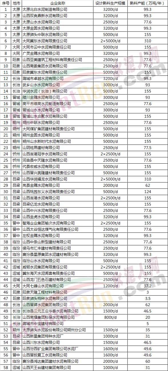 山西熟料生產(chǎn)企業(yè)名單