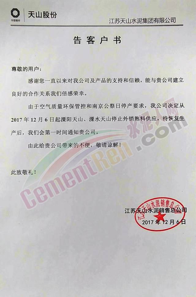 昨日,江蘇天山水泥銷(xiāo)售總公司發(fā)通知稱:由于空氣質(zhì)量環(huán)保管控和南京公祭日停產(chǎn)要求,公司決定從2017年12月6日起溧陽(yáng)天山、溧水天山停止外銷(xiāo)熟料供應(yīng)。