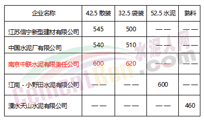 停限之后南京市本地水泥的出貨量銳減,水泥價(jià)格也出現(xiàn)一定的波動(dòng)。截止小編發(fā)稿時(shí)止,南京市主導(dǎo)企業(yè)的PC32.5水泥,PO42.5水泥報(bào)價(jià)皆在500元以上。具體報(bào)價(jià)見(jiàn)下表: