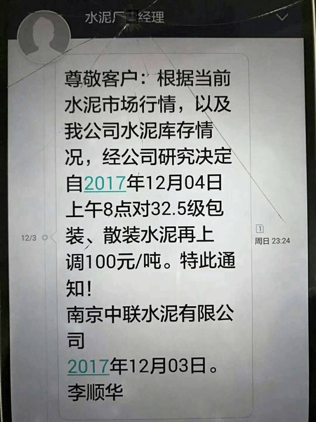 此前,南京中聯(lián)水泥有限公司發(fā)通知給下游客戶稱,根據(jù)當(dāng)前水泥市場(chǎng)行情,以及公司庫(kù)存情況,經(jīng)公司研究決定自12月4日上午8點(diǎn)起對(duì)32.5級(jí)包裝、散裝水泥上調(diào)100元/噸。上調(diào)后執(zhí)行的價(jià)格是32.5袋裝水泥620元/噸。