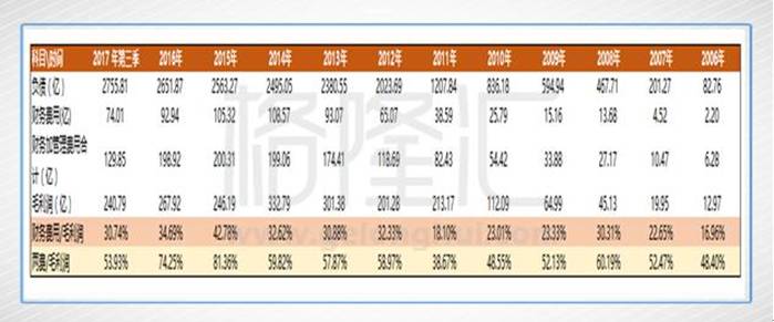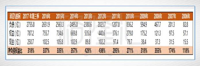 從上圖來看,資產負債率近年來一直在下降,絕對值雖高但卻感受不到異常,2017年第三季這數據更下降到77.78%。十年前,這一數字還停留在118%,十年后則完全超過320%,提升幅度超過2倍,鬼知道它經歷了什么。最高峰還去到不可思議的430%以上,還連續(xù)保持了兩個會計年度,這種“神技”也許只有央企才能做得出來。