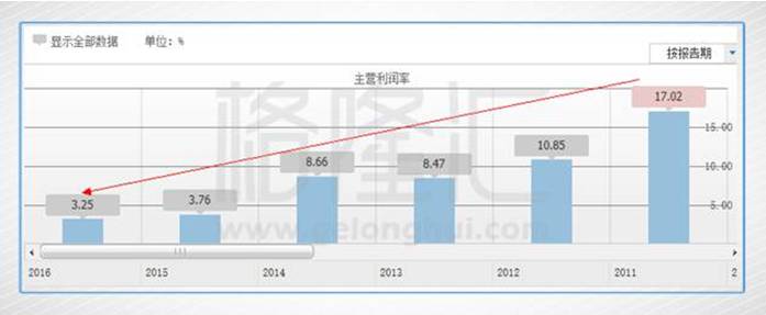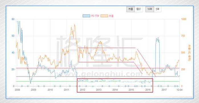 在2011年末至2014年末,中國建材的平均市盈率保持在4-5倍之間,表明上看起來很便宜,實際上是一個“價值陷阱”。2015年期間在這樣的估值基礎下,中國建材下跌幅度竟超過65%,究其原因,2015年及2016年的凈利潤不足30億,對比2012年-2014年年度平均凈利潤跌幅超2/3,再往深挖,造成凈利潤大跌50-60億級別主要原因在于毛利率的下跌,而財務費用、管理費用等巨額固定支出依然不減,致使上述兩費占毛利比由2014年的59.82%大幅上升至2015年的81.36%及2016年的74.25%。