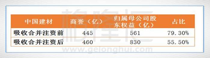 二、中國建材引人注目的地方除了高額的利息支出及固定支出外,其龐大的商譽的存在一直被市場人士咎病。2008-2011年商譽所占歸屬母公司公司權益超過50%,比2007-2006年度上了何止一個臺階。2012-2016年年度這個數據又比2008-2011年度再翻了一番,達到驚人的100%以上(峰值為2013年的119.83%),換言之,合并報表的商譽的數額一項完全超過了歸屬母公司股東權益的數值。如今最新一期報表顯示的商譽為445億,假若未來若碰上符合商譽減值測試的事件,每變動5%,則相關減值影響超過22億,而2016年年末的凈利潤數據僅為28億左右。(單從會計口徑角度思考)中國建材背著如此龐大的商譽資產彷如背著“定時炸彈”。
