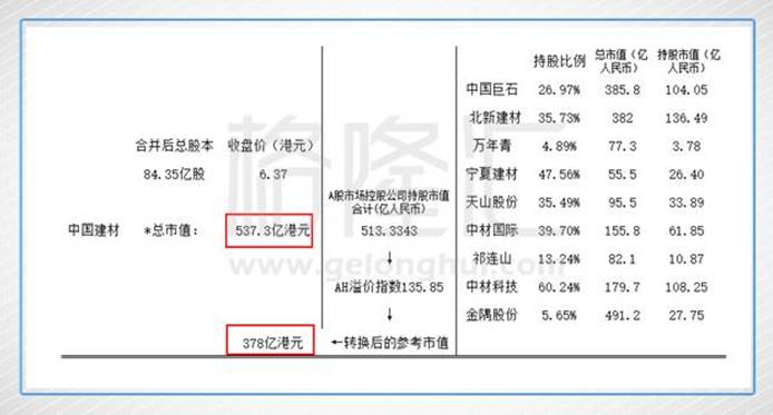 吸收合并中材股份后的中國建材的總股本為84.35億股,按照12月6日最新的收盤價6.37港元可知其重組后的總市值為537.3億港元,而其參股控股的主要A股上市公司合計持股市值為513.3億港元,若按照最新的AH溢價指數來“轉換”這部分市值來參考可得到378億港元,兩者的差額為135.3億港元。