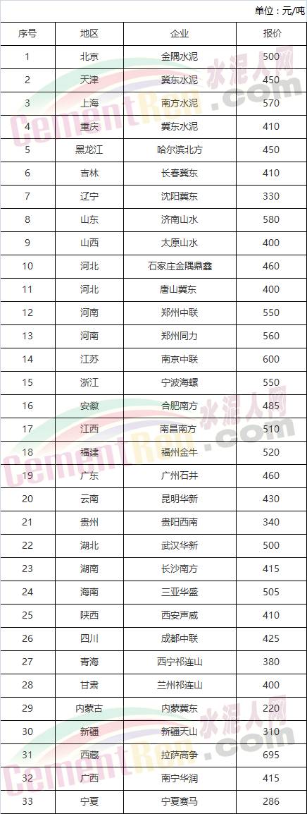 全國各區(qū)域PO42.5散裝水泥報(bào)價(jià)