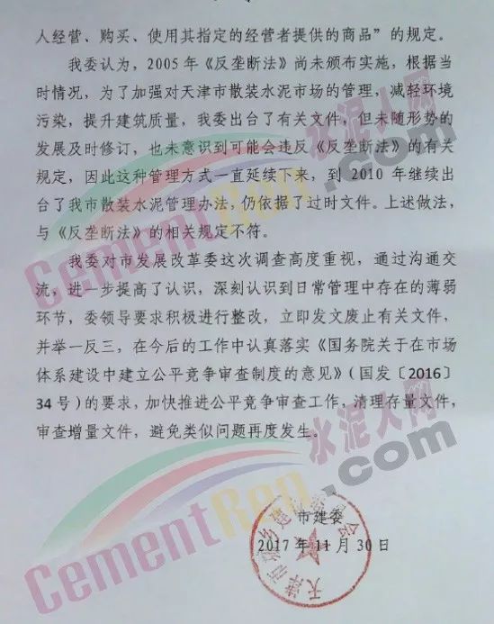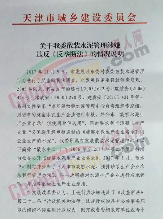 隨后,天津市城鄉(xiāng)建設(shè)委員會(huì)發(fā)布《關(guān)于我委散裝水泥管理涉嫌違反<反壟斷法>的情況說明》,明確表示:通過溝通交流,進(jìn)一步提高了認(rèn)識(shí),深刻認(rèn)識(shí)到日常管理中存在的薄弱環(huán)節(jié),委領(lǐng)導(dǎo)要求積極進(jìn)行整改,立即發(fā)文廢止相關(guān)文件。