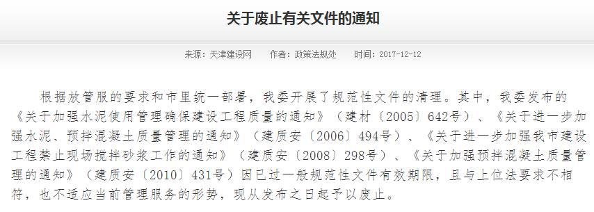 12月中旬,天津市場城鄉(xiāng)建設(shè)委員會(huì)發(fā)布《關(guān)于廢止有關(guān)文件的通知》,《關(guān)于加強(qiáng)水泥使用管理確保建設(shè)工程質(zhì)量的通知》(建材〔2005〕642號(hào))、《關(guān)于進(jìn)一步加強(qiáng)水泥、預(yù)拌混凝土質(zhì)量管理的通知》(建質(zhì)安〔2006〕494號(hào))、《關(guān)于進(jìn)一步加強(qiáng)我市建設(shè)工程禁止現(xiàn)場攪拌砂漿工作的通知》(建質(zhì)安〔2008〕298號(hào))、《關(guān)于加強(qiáng)預(yù)拌混凝土質(zhì)量管理的通知》(建質(zhì)安〔2010〕431號(hào))等文件。