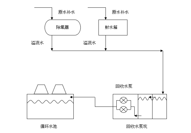 甘肅金泥集團有限責(zé)任公司干法二廠余熱電站總投資2800萬元,投產(chǎn)以來每年新增利潤數(shù)萬元,節(jié)約標(biāo)準(zhǔn)煤1.074萬噸,減排二氧化碳2.58萬噸。該余熱電站將原水通過活性炭過濾器及多介質(zhì)過濾器降低水體的濁度、除去懸浮雜質(zhì)、凈化水質(zhì),再經(jīng)過反滲透系統(tǒng)除去水中的微粒、有機物質(zhì)、膠體物和無機的陽離子、陰離子等水中雜質(zhì),進而得到除鹽水,再由物理除氧方式將其中氧氣剝離打進鍋爐,經(jīng)高溫廢氣加熱至過熱蒸汽帶動汽輪發(fā)電機做功發(fā)電,做功后的蒸汽再經(jīng)過循環(huán)水冷凝除氧進入鍋爐,如此往復(fù)形成一個汽水循環(huán)。要保證其穩(wěn)定運行,就需要將其中每一個環(huán)節(jié)做得一絲不茍,但面對北方水質(zhì)偏硬的現(xiàn)實問題,為了將循環(huán)水的硬度降至標(biāo)準(zhǔn)值不得不加大補水排污量,可是這樣又造成了不必要的水資源浪費,故對余熱電站內(nèi)除氧器及射水箱的工業(yè)補水溢流水進行了下圖所示的回收水系統(tǒng)改造。
