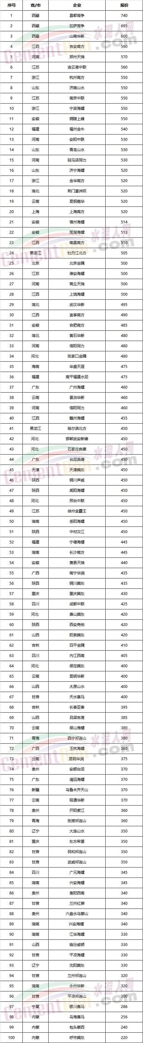 100家水泥企業(yè)報價