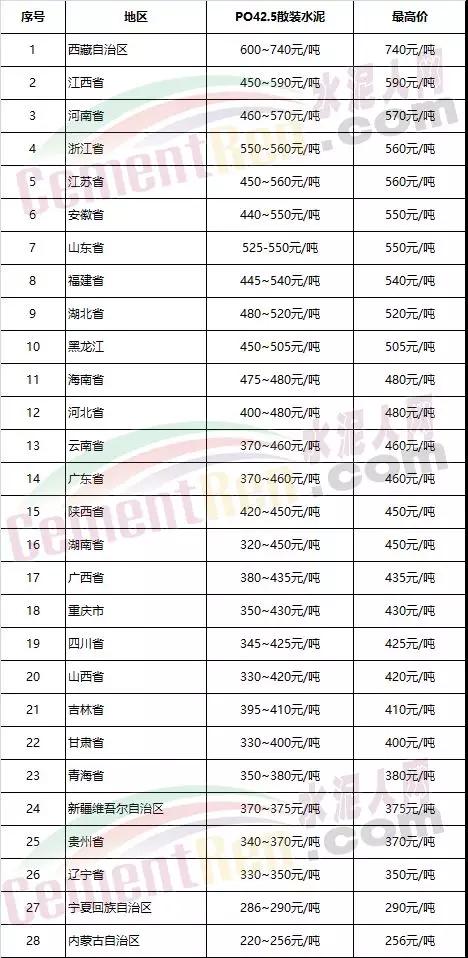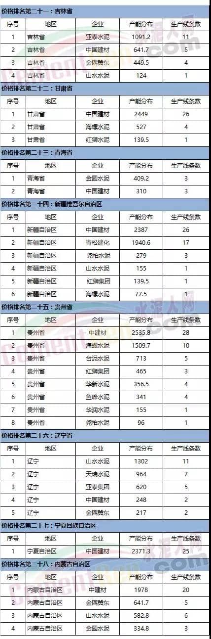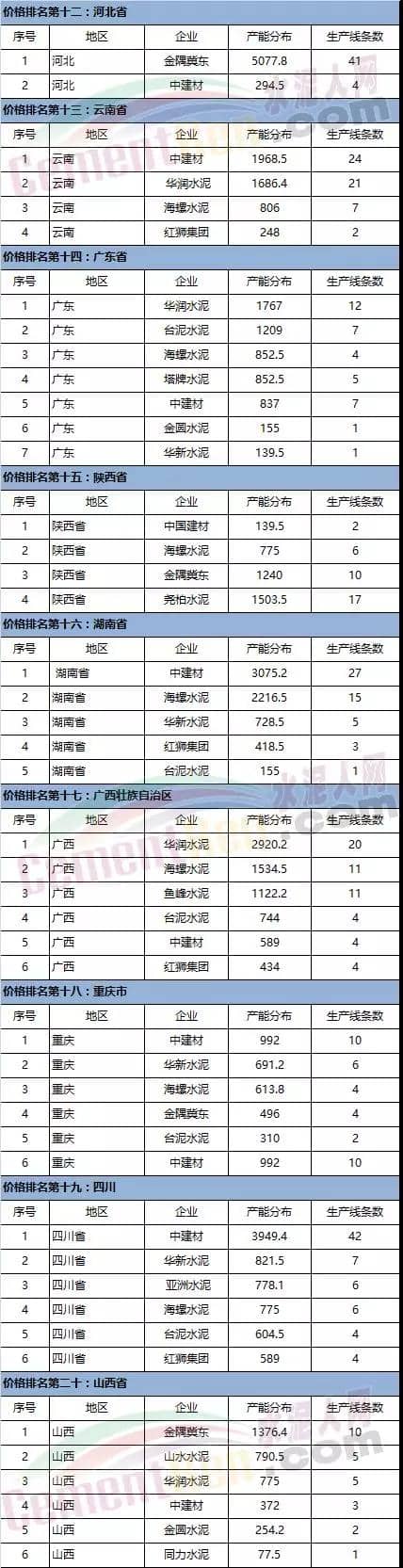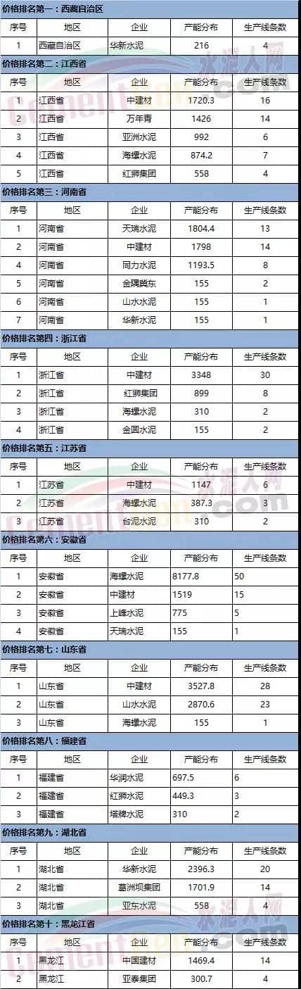 水泥價(jià)格排名靠前省份的產(chǎn)能分布
