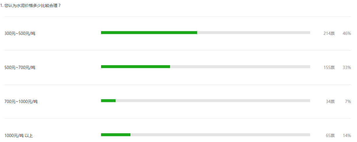 7、46%的業(yè)內(nèi)人士認(rèn)為水泥價(jià)格應(yīng)該在300~500元之間