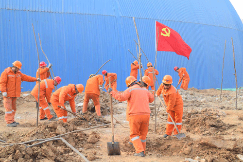 植樹地點位于公司三線石灰石堆場北側(cè)的山坡上,活動現(xiàn)場,黨員團員充分發(fā)揮模范帶頭作用,大家在領(lǐng)取了樹苗和工具后,緊張有序的開始勞動,植樹現(xiàn)場,立刻呈現(xiàn)出一派繁忙的勞動景象。參加植樹的職工個個熱情洋溢、干勁十足,有的拿鐵鍬,有的扶樹苗,你追我趕,比干勁、比進(jìn)度,各個環(huán)節(jié)銜接有序,樣樣做得認(rèn)真到位,個個忙得滿頭大汗。到處都是忙碌的身影和勞動的歡聲笑語……大家干勁十足地完成了從挖坑、放樹、填土、踩實到最后澆水的每一個步驟。熱火朝天的場景,與不遠(yuǎn)處鮮紅的黨旗團旗遙相呼應(yīng)、熠熠生輝。經(jīng)過大家辛勤地勞動,一棵棵樹苗扎根于沃土,煥發(fā)出勃勃生機。