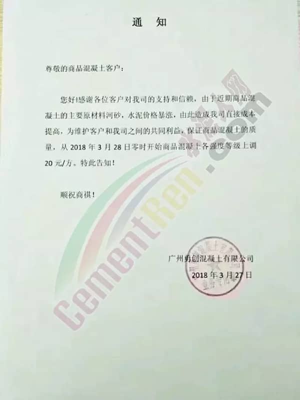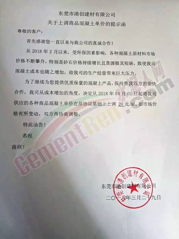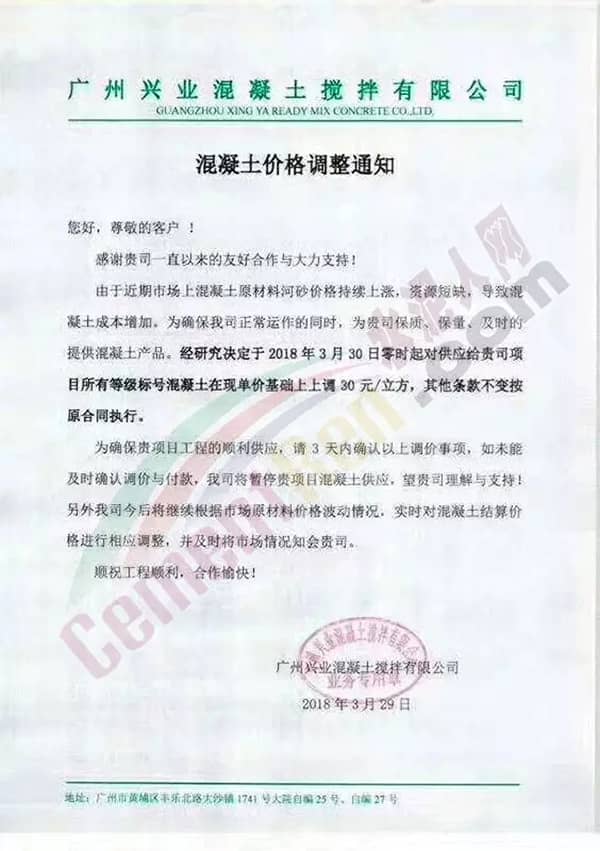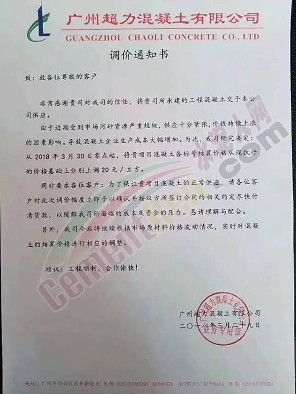 東莞市翔富混凝土有限公司《升價(jià)函》中提到,自2018年3月以來,混凝土原材料不降反升,特別是砂已連續(xù)4輪上漲,累計(jì)漲幅25元/噸,且貨源供應(yīng)緊張。直接導(dǎo)至混凝土企業(yè)經(jīng)營(yíng)成本增長(zhǎng)。