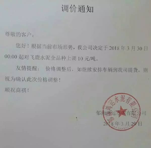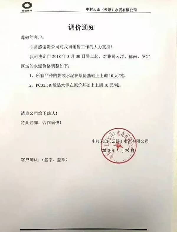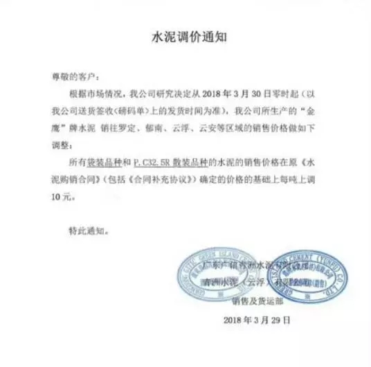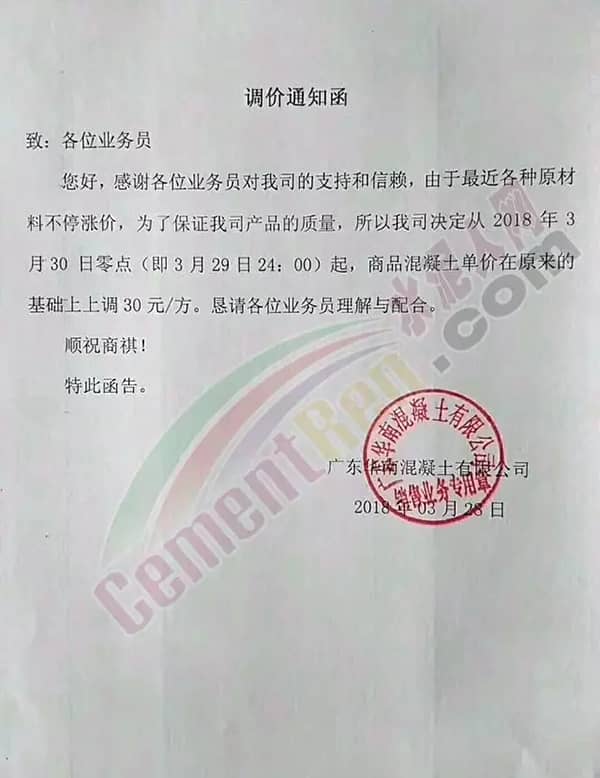 水泥人網(wǎng)通訊員消息,廣東省部分水泥企業(yè)也于昨日(29日)通知上調(diào)水泥價(jià)格,調(diào)價(jià)函如下: