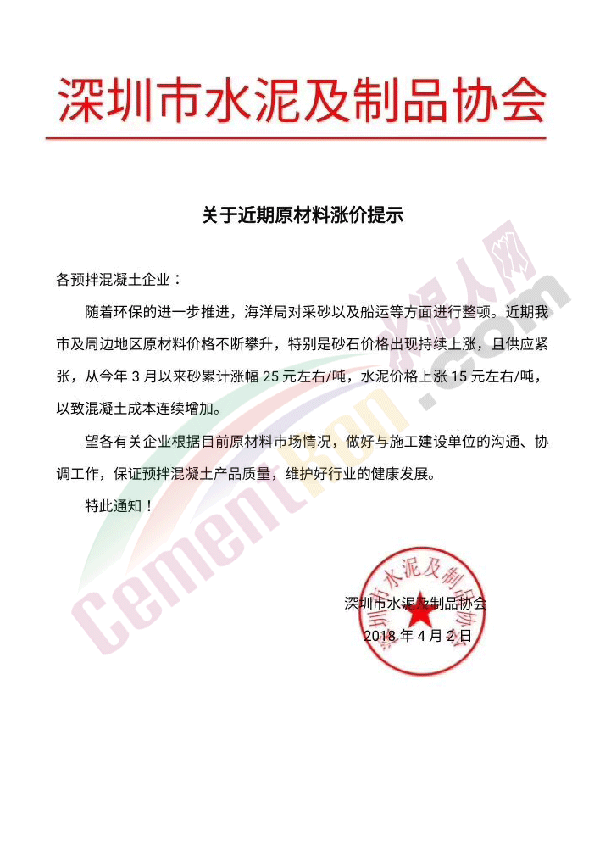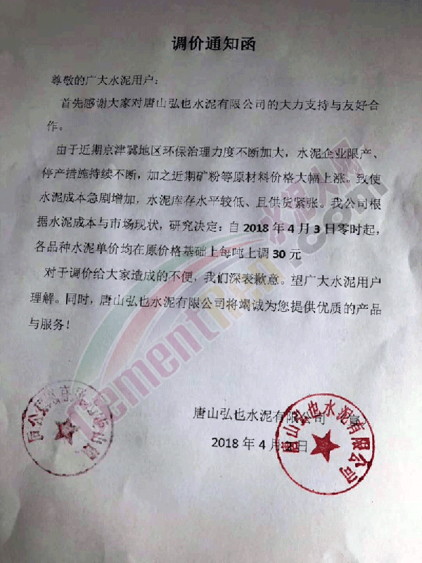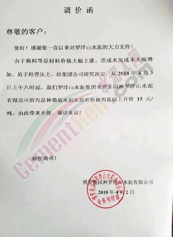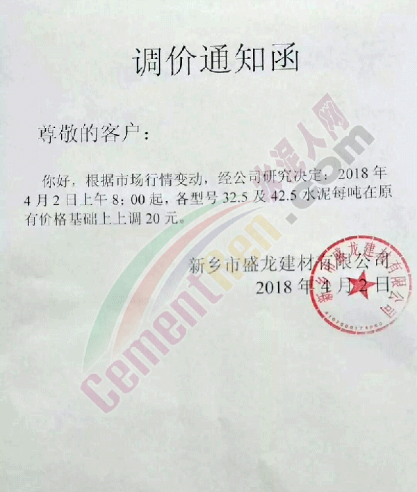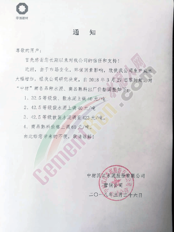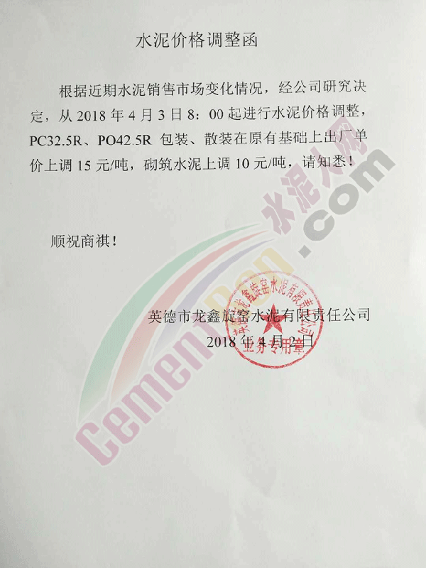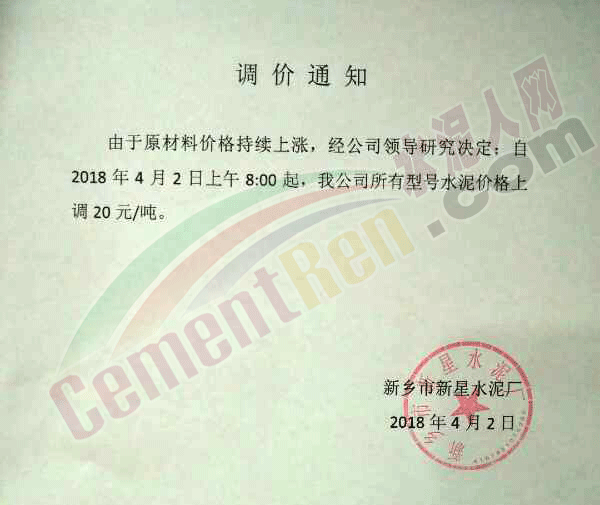 由于原材料價格持續(xù)上漲,經公司研究決定,自2018年4月2日早8:00起各品種水泥價格在原來價格基礎上上調20元。