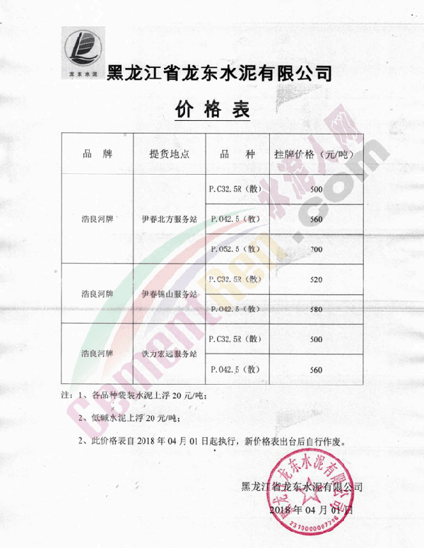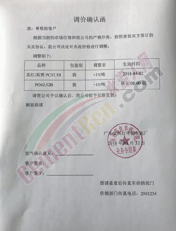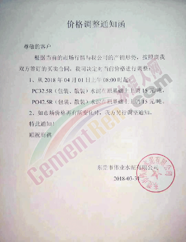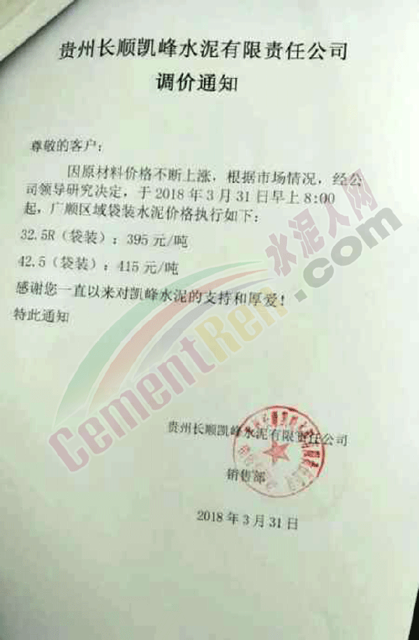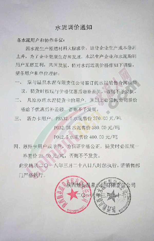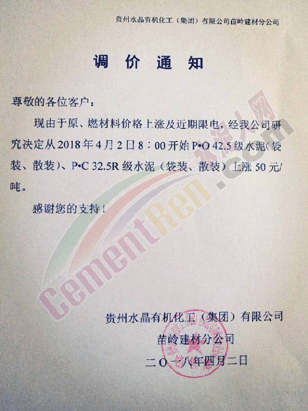 由于原材料價格持續(xù)上漲,經公司領導研究決定,自2018年4月2日早8:00起各品種水泥價格在原來價格基礎上上調20元。