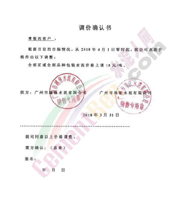 從2018年4月1日8時起,我司羊城牌各品種包裝水泥上調15元/噸。
