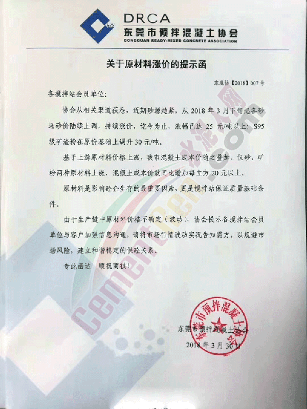此前,東莞市預拌混凝土協(xié)會也有發(fā)布《關于原材料漲價的提示函》稱協(xié)會從相關渠道獲悉,近期砂源趨緊,從2018年3月下旬各砂場砂價陸續(xù)上調,漲幅已達25元/噸以上,S95級礦渣粉在原價基礎上調30元/噸。基于上游原材料價格上漲,東莞市混凝土成本價隨之疊加,僅砂、礦粉兩種原材料上漲,混凝土成本價就同比增加每立方20元以上。