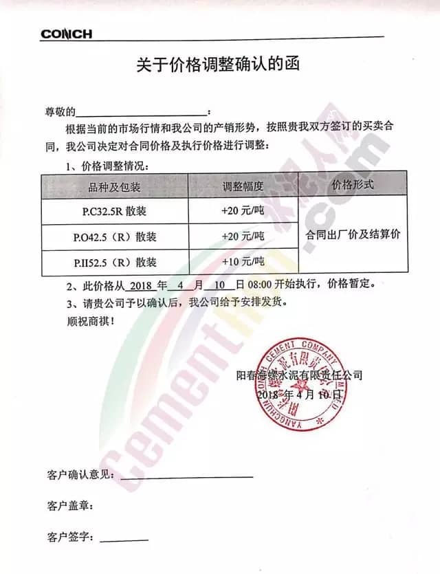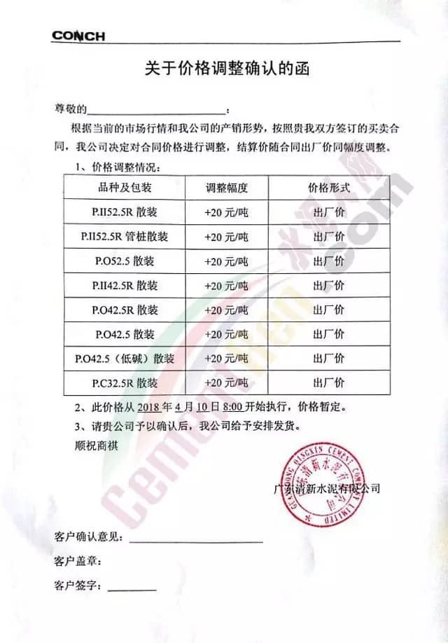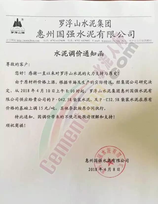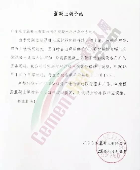 散裝、包裝全品種漲價(jià)廣東東方混凝土有限公司4月8日發(fā)布調(diào)價(jià)函稱,由于受到近期混凝土原材料價(jià)格持續(xù)大幅上漲,特別是中砂、碎石上漲幅度較大,且有時(shí)會出現(xiàn)斷供現(xiàn)象,原材料的大幅上漲,使混凝土成本大幅增加,為確?;炷临|(zhì)量不受影響及各用戶的正常用砼,公司研究決定對混凝土銷售價(jià)格進(jìn)行調(diào)整,自2018年4月9日零時(shí)起,每立方砼在原單價(jià)基礎(chǔ)上上調(diào)15元。