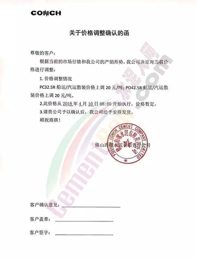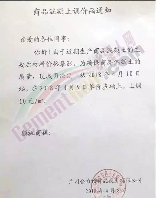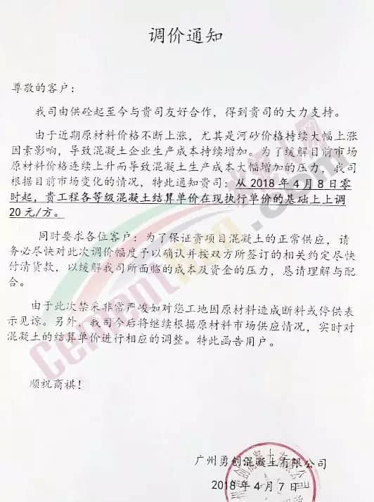 混凝土調(diào)價(jià)通知
