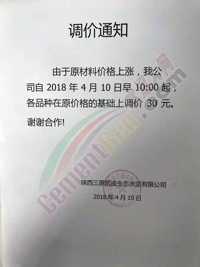 昨日陜西咸陽市粉磨站企業(yè)陜西三原凱迪生態(tài)水泥有限公司發(fā)布提價(jià)通知稱,由于原材料價(jià)格上漲,自4月10日早10點(diǎn)起各品種水泥在原價(jià)格的基礎(chǔ)上上調(diào)30元/噸。