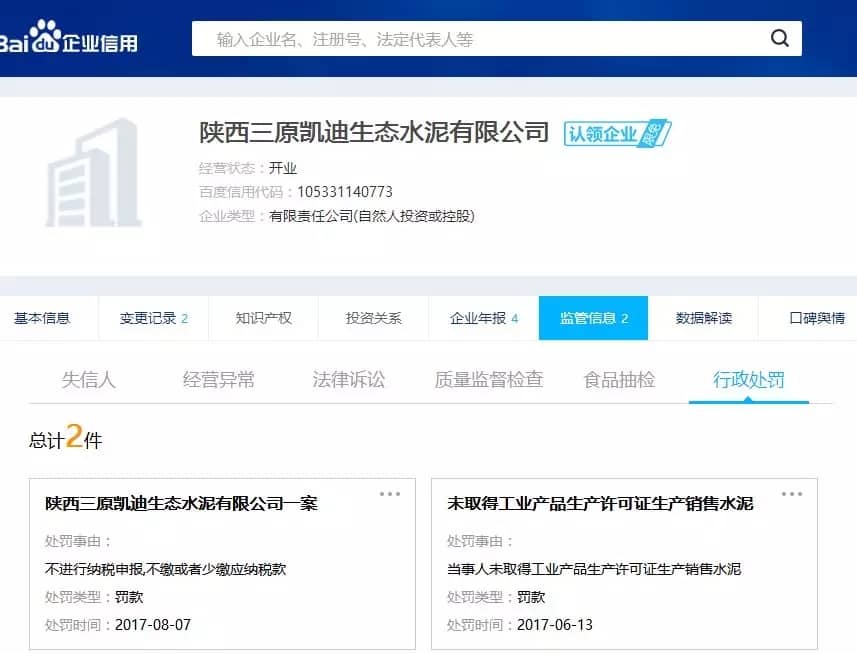 據(jù)查詢,此企業(yè)因未取得生產(chǎn)許可證生產(chǎn)銷售水泥,曾在2017年6月被罰款。